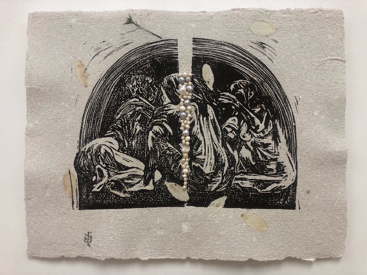 Etching on handmade paper, pearls, raccoon teeth